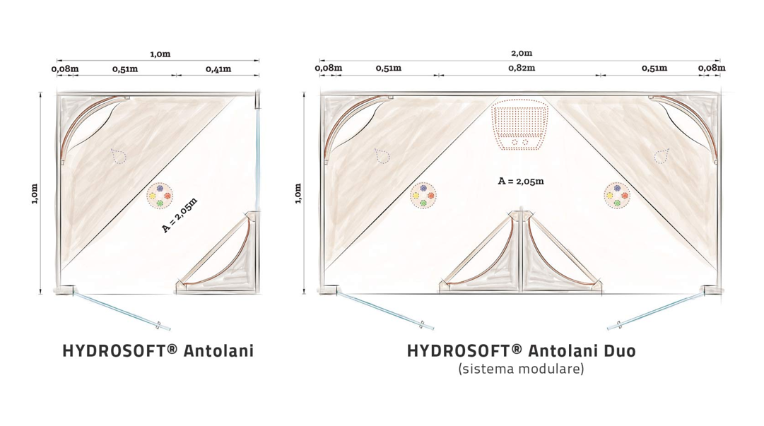 Hydrosoft Antolani Duo con sedute diagonali, ampie e confortevoli, due superfici scaldanti per seduta e parete attrezzata integrata.