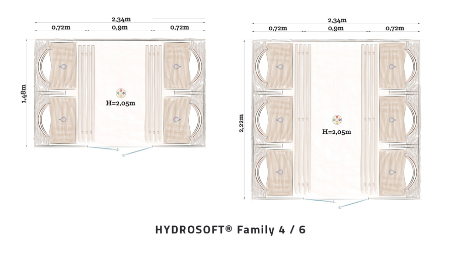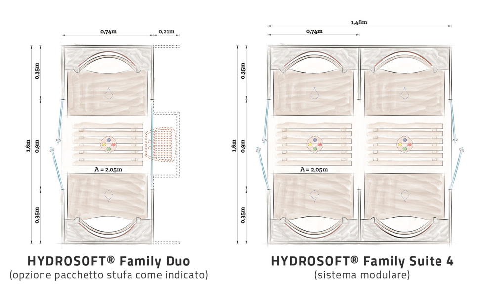 A differenza delle tradizionali saune, i modelli Hydrosoft Family consumano poca energia (da 3,8 kW).