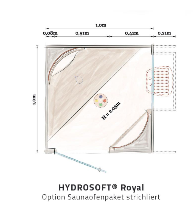 La Royal dispone di una superficie scaldante nella parte frontale e in quella posteriore (con parete multi fitness integrata), che enfatizza ulteriormente il piacere del calore avvolgente. Con la disposizione diagonale della seduta, la cabina diventa perfetta per essere posizionata nell‘angolo – nella propria casa come in hotel. La Royal, grazie al sistema costruttivo modulare, può essere raddoppiata per un secondo posto in qualsiasi momento (Royal Duo).